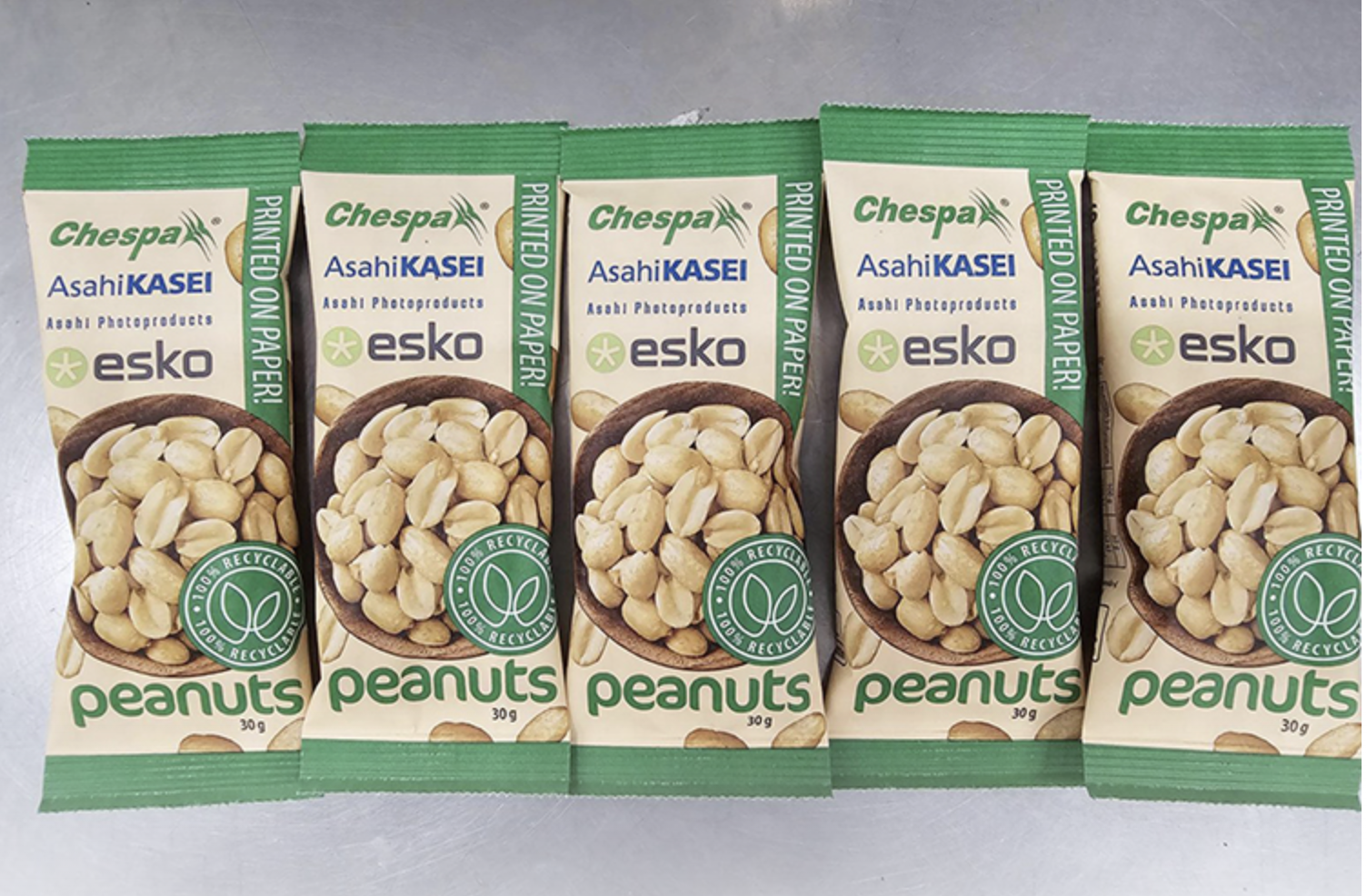 The project conducted in collaboration with Asahi and Esko using sustainable substrates and inks as well as carbon neutral printing plates from Asahi, was tested with a chocolate manufacturer using Chespa’s FlexiBio water-based inks, and a manufacturer of peanut-based products using Chespa’s FlexiEco water-based inks.