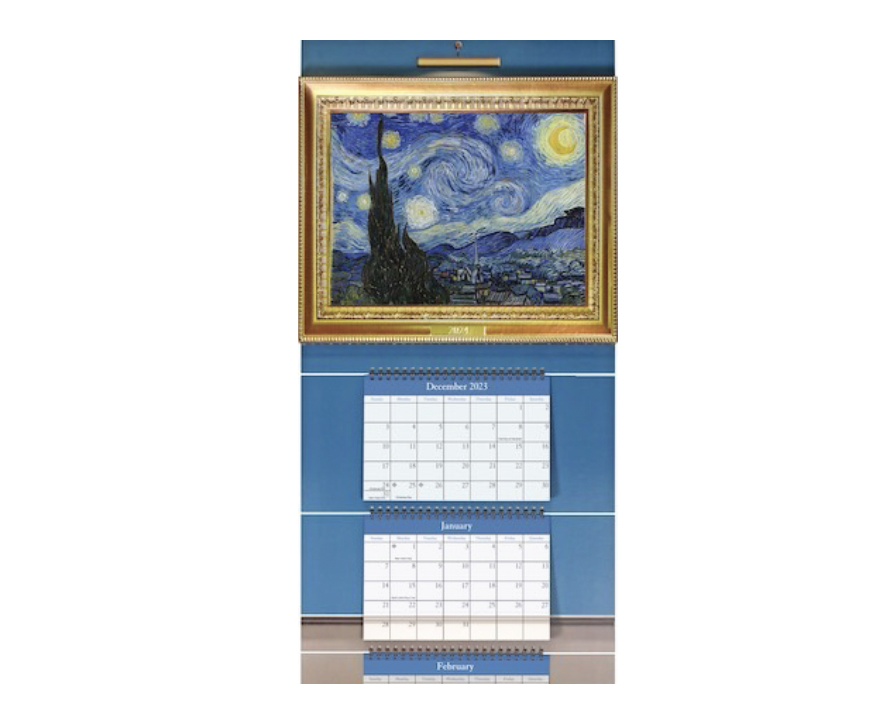 The calendar reproduces beautiful and evocative Impressionist masterpieces in a gilded gold frame enclosing works of art from Vincent van Gogh, Édouard Manet, Pierre-Auguste Renoir, and Henri-Edmond Cross – perfect for a stylish home or office setting. The dimensional picture frame features side closures with locking tabs, allowing the recipient to change the artwork at any time.